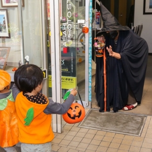 仮装した子ども達が保護者同伴で街を巡り、75店舗以上の加盟店舗スタッフに「トリック・オア・トリート!」と声をかけると、店舗及び地域のお菓子メーカー各社が協賛したお菓子がもらえる流れです。