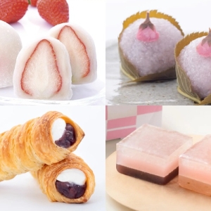 桜の葉を練りこんだこし餡、しろ餡の羊羹の上に桜色の羊羹を重ね、道明寺を浮かべた錦玉(寒天)を合わせています。