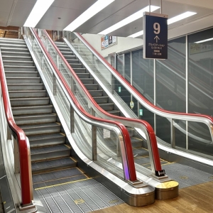 エスカレーターの手すりは端の方でU字のように巻き込まれていくのが一般的ですが、こちらは「垂直落下式」と呼ばれるタイプ。