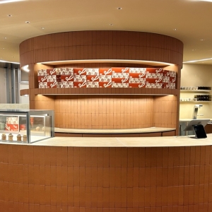 カウンター、テーブル、物販棚、店頭看板には細かな模様も特徴的なFRP素材を使用。